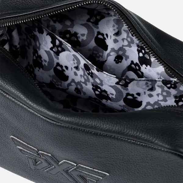 This PXG toiletry bag is wrapped in pebble leather and accented with an applique PXG logo. The bag features a skull camo lining and a leather loop. Its size is 3.5 x 10.5 x 3.